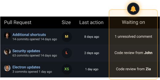 - List of pull requests pending review. Each pull request has a column for "Status," "Last action," "Reviewers," "Size" and "Description."