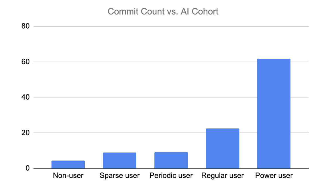 This data can be applied to calculate the discrepancy between "Non-User" and "Power User" AI usage cohorts. Contrary to recent AI research (including our own) suggesting a sub-50% increase in durable code change, this directly measured data suggests it may be time to recalibrate expectations: